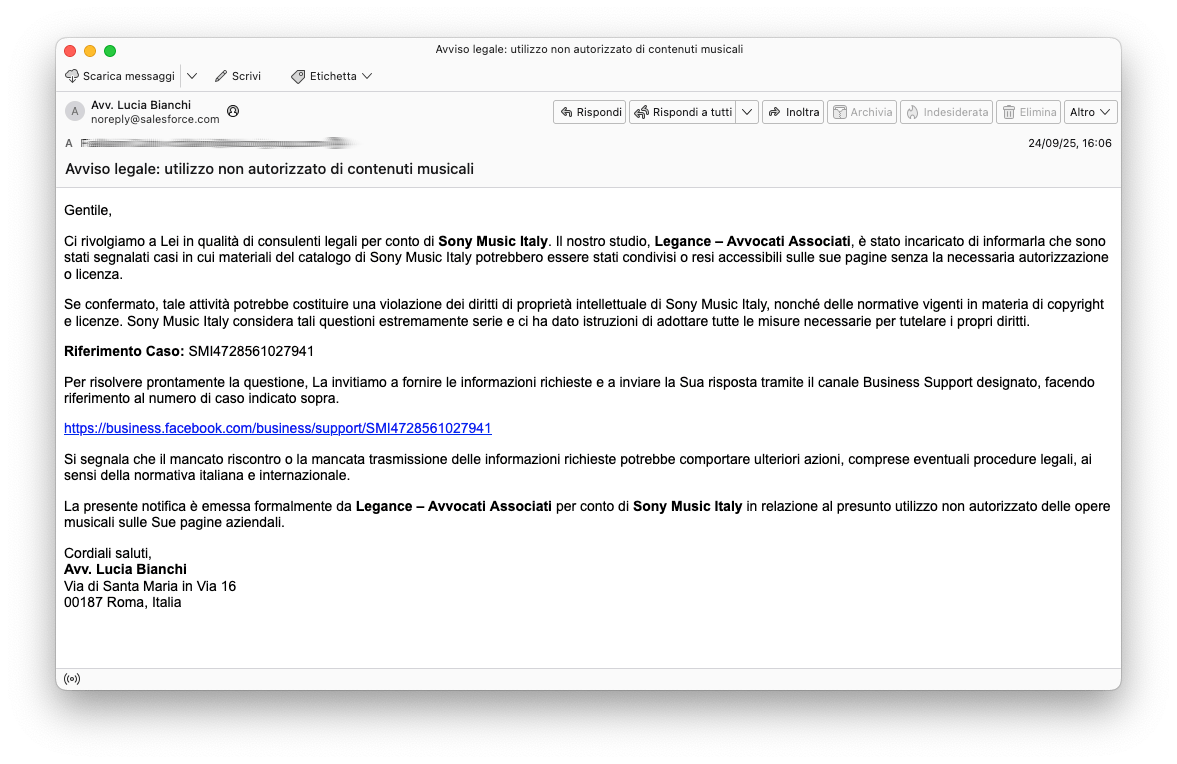 Il testo della comunicazione simula una notifica legale proveniente da Sony Music Italy tramite lo studio Legance – Avvocati Associati, sostenendo che i contenuti musicali protetti da copyright sarebbero stati condivisi senza autorizzazione sulle pagine Facebook del destinatario. Per aumentare la pressione psicologica viene fornito un numero di caso fittizio e si prospettano possibili conseguenze legali. All’interno del messaggio è presente un link che sembra appartenere a business.facebook.com, ma che in realtà reindirizza verso un dominio esterno creato Ad-Hoc dai criminali (metahelp-support[.]com).